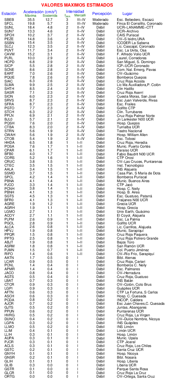 La siguiente tabla muestra los valores de Aceleración Máxima o aceleración pico (PGA por sus siglas en inglés). Este es el valor máximo en cualquiera de las 3 componentes del registro.