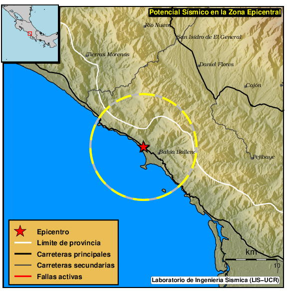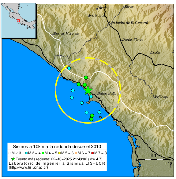 El sismo de mayor magnitud ha sido el del 20-08-2019 a las 10:21:03 con M4.4. Dentro del perímetro viven 0 personas y el lugar más poblado es Uvita, Bahí a Ballena con de Osa habitantes.