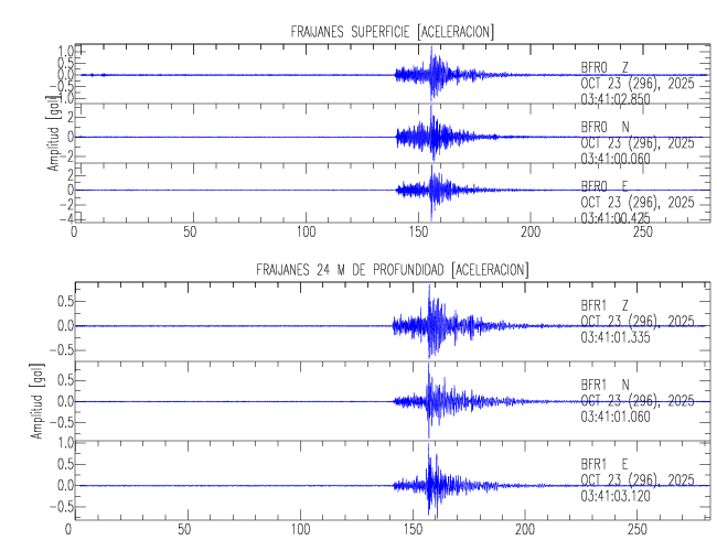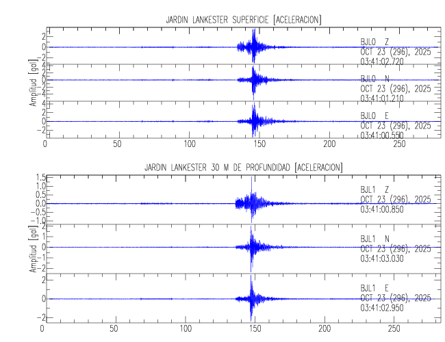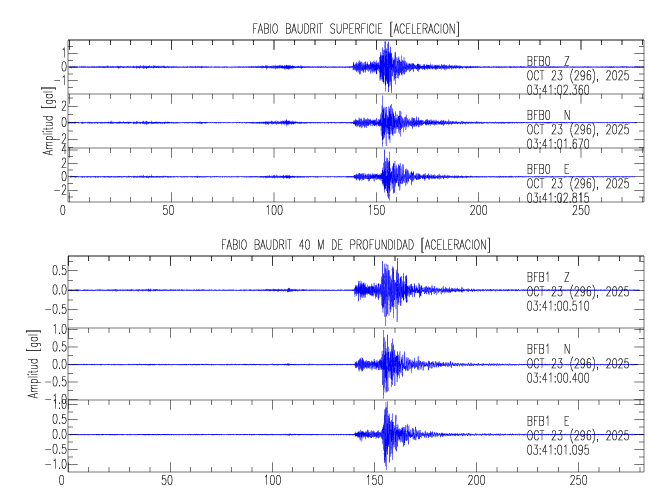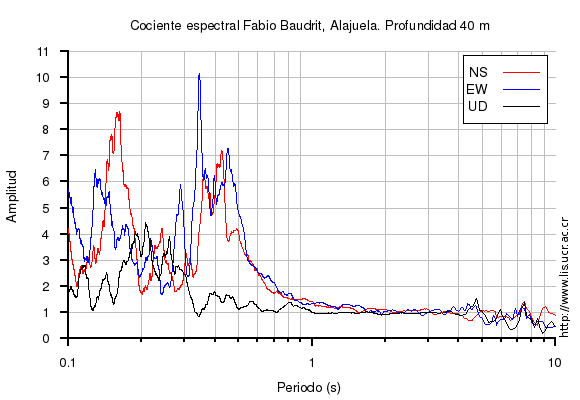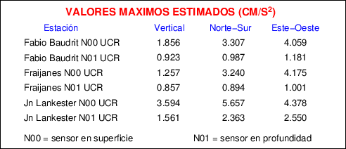 Aquí se muestran las formas de onda y cocientes espectrales de los sensores colocados en pozo . Uno se ubica en el Jardín Lankester en Paraíso de Cartago con 30 m de profundidad y el otro en la Estación Experimental Fabio Baudrit en Alajuela con 40 m de profundidad. La tabla muestra los valores de aceleración máxima (PGA) leídos de las tres componentes en superficie (N00) y en profundidad (N01)