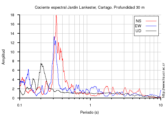 El cociente espectral se obtuvo dividiendo el espectro de amplitud de la componente en superficie con respecto a la componente en profundidad (NS=norte-sur, EW=este-oeste, UD=vertical)