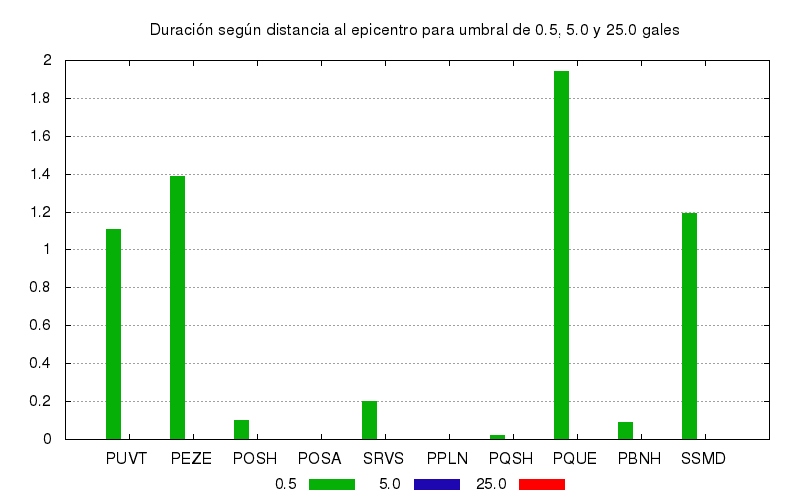 La duración para otros niveles de aceleración también se calculó. Este es el gráfico con los valores de duración para umbrales de 0.5, 5.0 y 25.0 gales. Se muestran los 10 primeros sitios ordenados por su cercanía el epicentro.