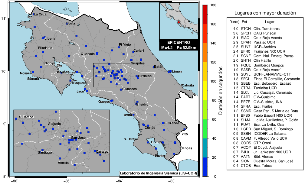 Este mapa muestra la duración en cada sitio de registro del LISUCR. Este parámetro se calculó sumando el tiempo que la amplitud del registro se mantuvo por encima de 0.5 cm/2. La tabla detalla el valor de los primeros 30 sitios con el código de la estación y el nombre del lugar donde se ubica.