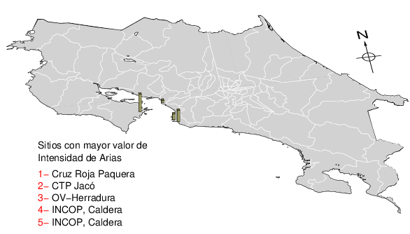 El terremoto de Sámara del 05 de setiembre del 2012 alcanzó un valor de 1207.0 cm/s en la estación de Nosara (GNSR) muy cerca del epicentro. El terremoto de Piedras Negras, que causó graves daños a la ciudad de Alajuela el 22 de diciembre de 1990, alcanzó un valor de 174 cm/s en una estación ubicada en el centro de la ciudad.