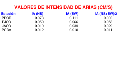 En esta sección se muestra el cáculo de la IA para la componente norte-sur (NS) y este-oeste (EW) de los registros de aceleración que tuvieron valores superiores a los 5 cm/s2, así como el valor total de esta que corresponde al promedio de ambas componentes horizontales.
