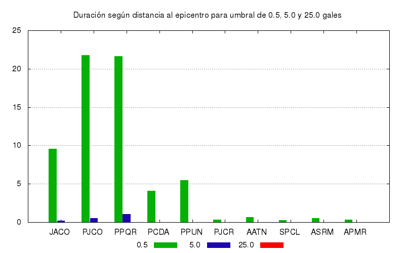La duración para otros niveles de aceleración también se calculó. Este es el gráfico con los valores de duración para umbrales de 0.5, 5.0 y 25.0 gales. Se muestran los 10 primeros sitios ordenados por su cercanía el epicentro.