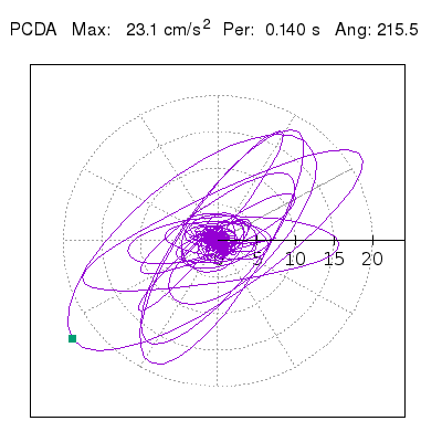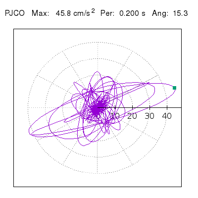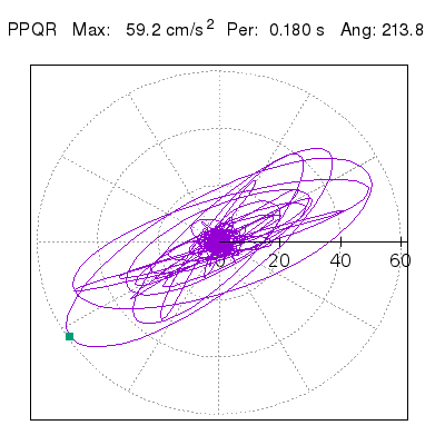 Tomando el periodo en el cual se presenta la amplitud máxima del espectro de respuesta máxima para cada estación, se representa la respuesta bidireccional en función del tiempo sobre el plano horizontal. Se identifica el punto (color verde en cada figura) del cual se desprende la orientación mostrada en el mapa de la sección superior. El valor de la acelereración máxima corresponde al punto del espectro de respuesta para el periodo indicado.