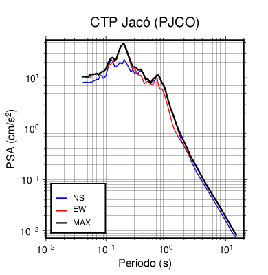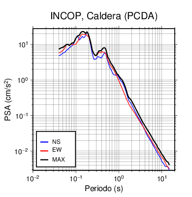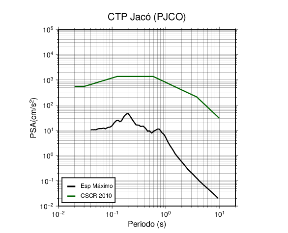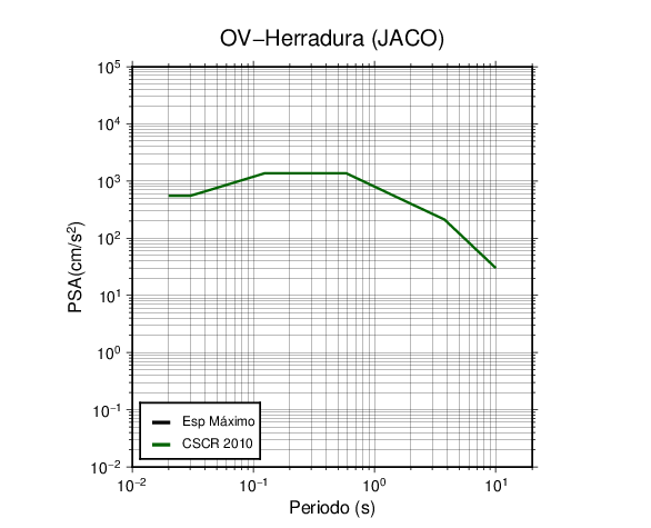 En los siguientes gráficos, la traza verde es el espectro propuesto por el CSCR-2010, la traza negra es el espectro máximo de este sismo. El valor de la amplitud está dado en pseudoaceleración en cm/s2.