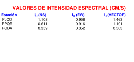 En esta sección se muestra el cáculo de la intensidad de Housner, IH para la componente norte-sur (NS) y este-oeste (EW) y la suma vectorial de los registros de aceleración que tuvieron valores superiores a los 5 cm/s2.