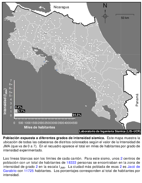 Cada punto sobre el mapa es la cabecera de un distrito. El número de habitantes que hay en cada uno se suma si se encuentra dentro de una misma zona de intensidad sísmica y el total se muestra en el recuadro en manera de porcentajes del total de la población y en miles de habitantes.