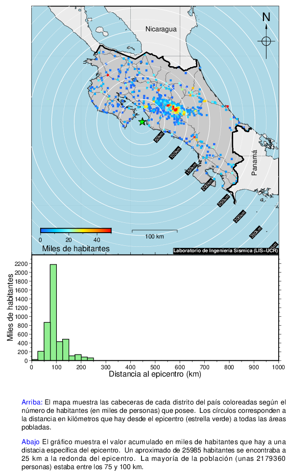 Este mapa muestra la ubicación del epicentro y la cantidad de habitantes que se encontraban a una cierta distancia de este. Los intervalos son de 25 km.