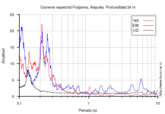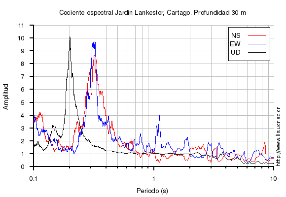 El cociente espectral se obtuvo dividiendo el espectro de amplitud de la componente en superficie con respecto a la componente en profundidad (NS=norte-sur, EW=este-oeste, UD=vertical)