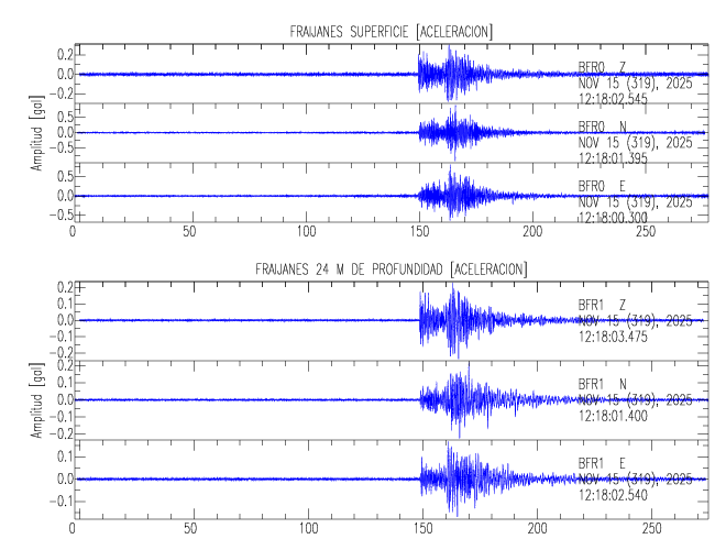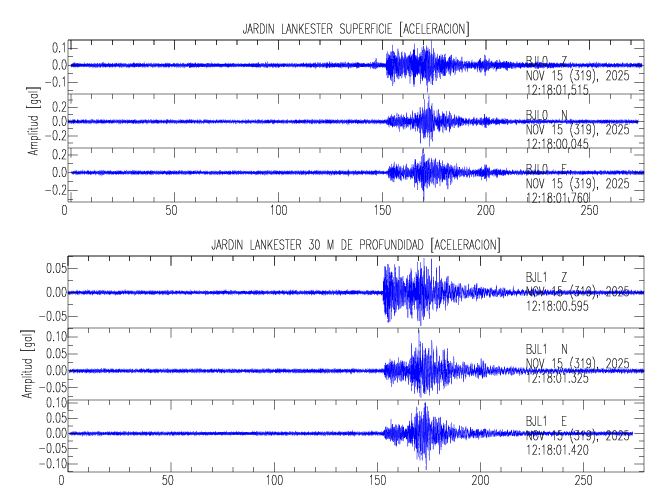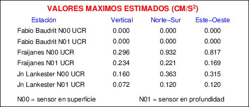 Aquí se muestran las formas de onda y cocientes espectrales de los sensores colocados en pozo . Uno se ubica en el Jardín Lankester en Paraíso de Cartago con 30 m de profundidad y el otro en la Estación Experimental Fabio Baudrit en Alajuela con 40 m de profundidad. La tabla muestra los valores de aceleración máxima (PGA) leídos de las tres componentes en superficie (N00) y en profundidad (N01)