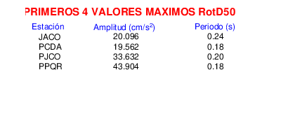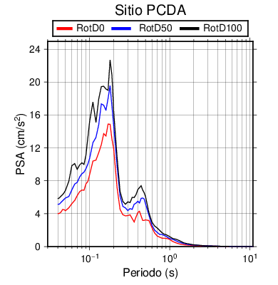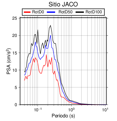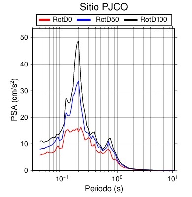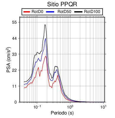 RotD50 representa un valor medio de la respuesta por lo cual se puede comparar con valores de otras medidas empleadas en modelos de atenuación como la Media Geométrica de las componentes ortogonales (GM). RotD0 y RotD100 son los valores extremos (mínimo y máximo), los cuales nos pueden servir para determinar la dispersión de la posible respuesta en cada sitio.