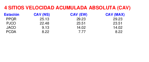 La velocidad acumulada absoluta (CAV por sus siglas en inglés) es otro parámetro que se usa para caracterizar el movimiento fuerte del suelo. Los datos están dados en cm/s para las componentes norte-sur (NS) y este-oeste (EW). El máximo de ambas se da en la tercera columna.