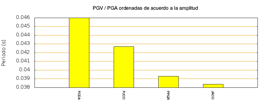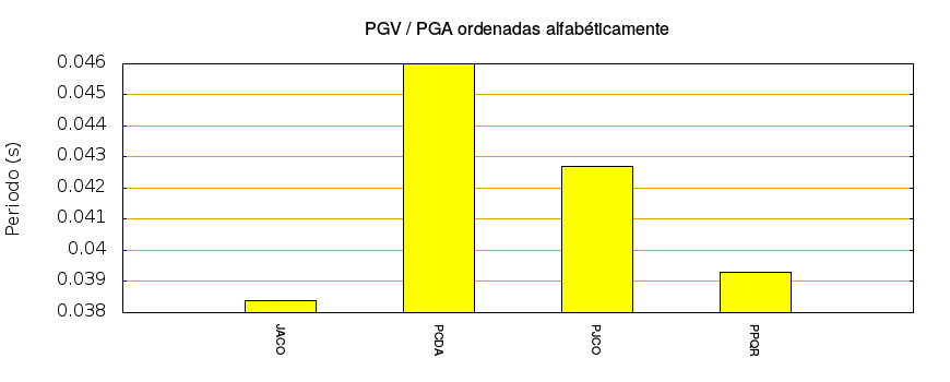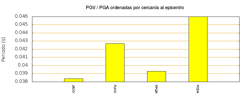 El cociente de la velocidad máxima (PGV) entre la aceleración máxima (PGA) brinda información de los periodos más significativos del movimiento del suelo. En el gráfico siguiente se muestran las estaciones ordenadas por su cercanía al epicentro. La más cercana está a la izquierda y la más lejana a la derecha. También se muestran los mismos datos en orden alfabético y ordenados de mayor a menor amplitud.