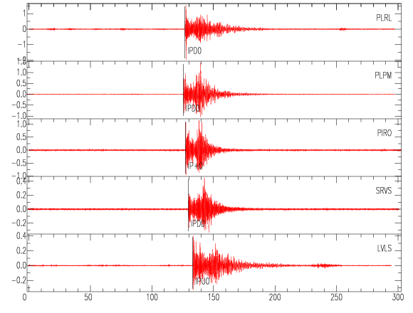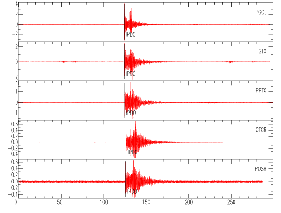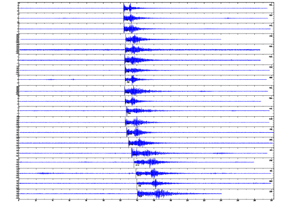 Mapa del epicentro: Los triángulos verdes son las estaciones acelerográficas usadas para calcular el epicentro que se muestra como un punto amarillo. El detalle de la magnitud y distancia a San José se muestra en el cuadro inserto en el mapa.