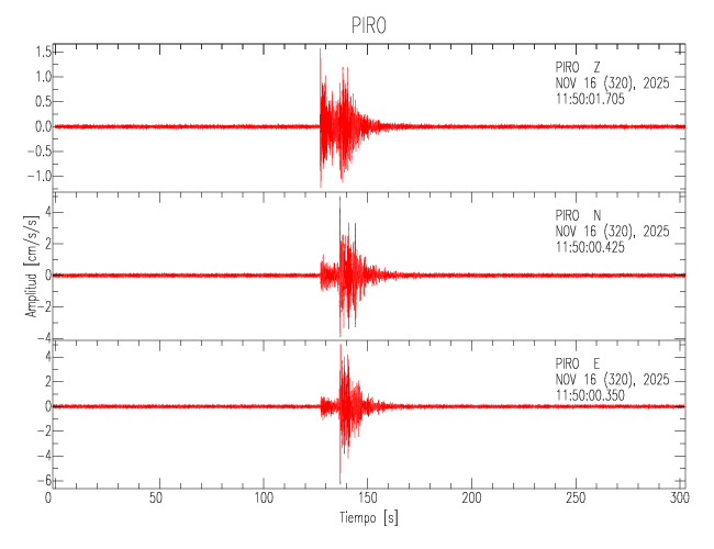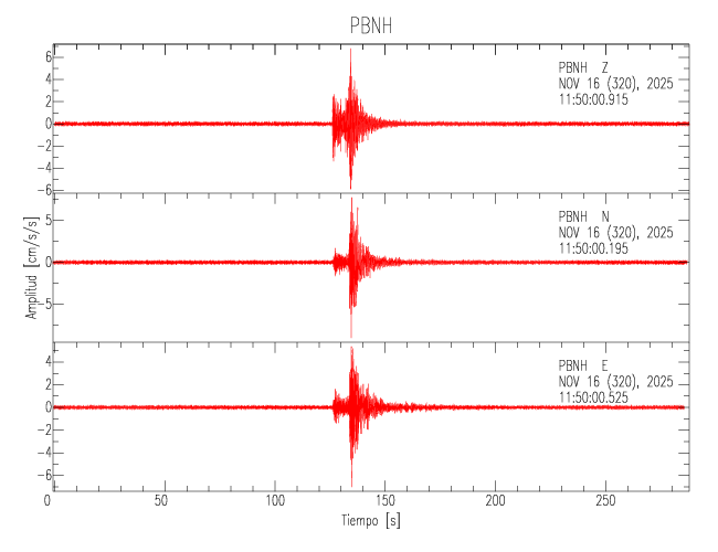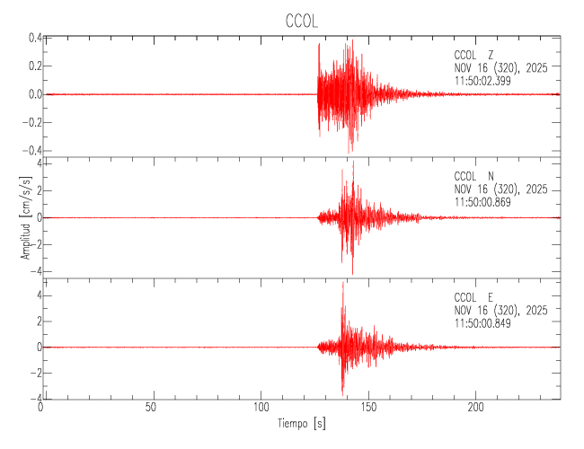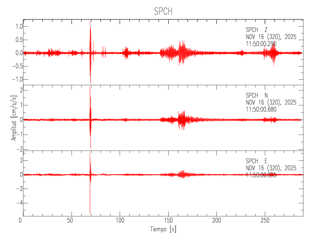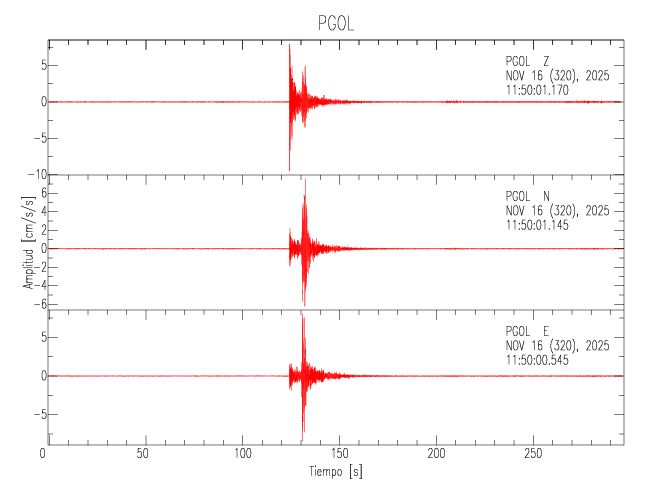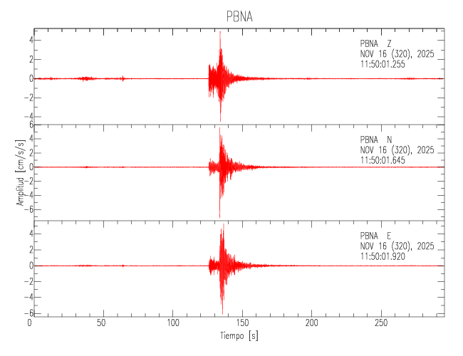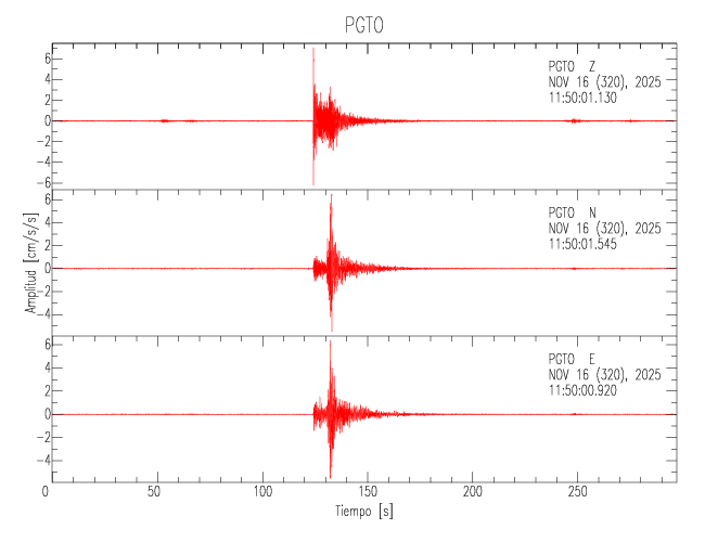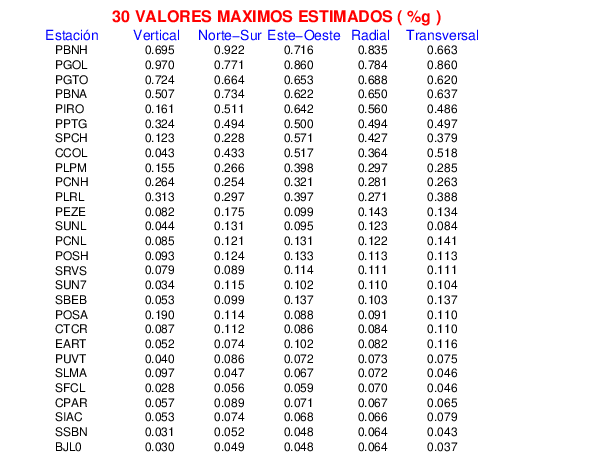 La siguiente tabla muestra los datos de aceleración máxima para cada componente en porcentaje de la aceleración de la gravedad (%g). Estos se obtienen dividiendo el valor del PGA registrado por 980 cm/s2 y multiplicándolo por 100. Los valores de las últimas dos columnas corresponden a la componente radial y transversal. Los datos se listan en orden descendente según el valor de la componente radial.