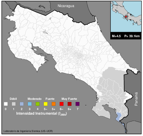 Este mapa muestra la división política de Costa Rica a nivel de distritos. Según nuestros cálculos, la intensidad de grado 2 o superior en la escala de JMA (que varía de 0 a 7) afectó un total de 1 distritos. La lista de estos se muestra bajo del mapa en orden alfabético.