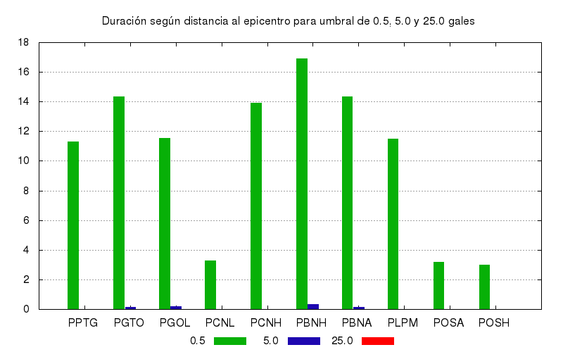 La duración para otros niveles de aceleración también se calculó. Este es el gráfico con los valores de duración para umbrales de 0.5, 5.0 y 25.0 gales. Se muestran los 10 primeros sitios ordenados por su cercanía el epicentro.