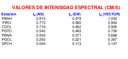 En esta sección se muestra el cáculo de la intensidad de Housner, IH para la componente norte-sur (NS) y este-oeste (EW) y la suma vectorial de los registros de aceleración que tuvieron valores superiores a los 5 cm/s2.