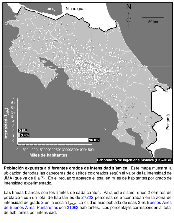 Cada punto sobre el mapa es la cabecera de un distrito. El número de habitantes que hay en cada uno se suma si se encuentra dentro de una misma zona de intensidad sísmica y el total se muestra en el recuadro en manera de porcentajes del total de la población y en miles de habitantes.