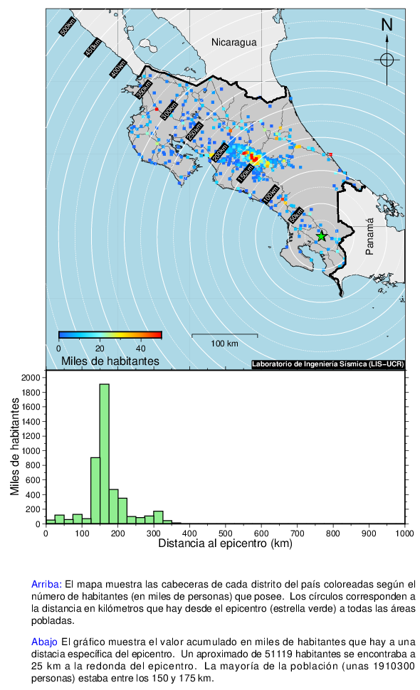 Este mapa muestra la ubicación del epicentro y la cantidad de habitantes que se encontraban a una cierta distancia de este. Los intervalos son de 25 km.