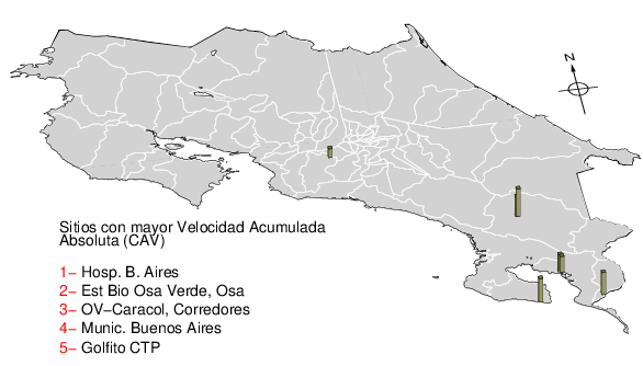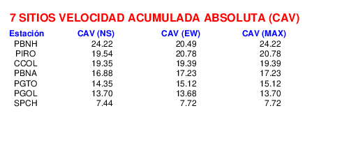La velocidad acumulada absoluta (CAV por sus siglas en inglés) es otro parámetro que se usa para caracterizar el movimiento fuerte del suelo. Los datos están dados en cm/s para las componentes norte-sur (NS) y este-oeste (EW). El máximo de ambas se da en la tercera columna.