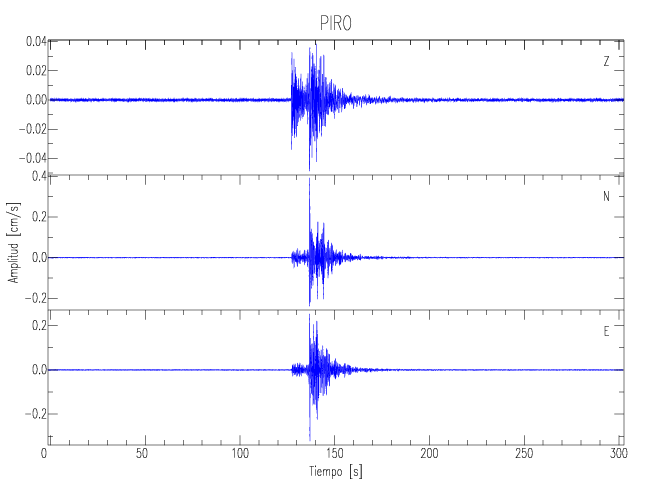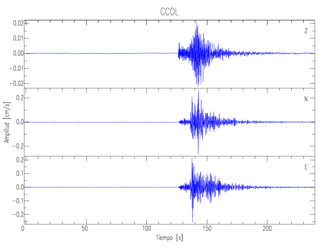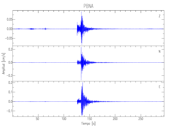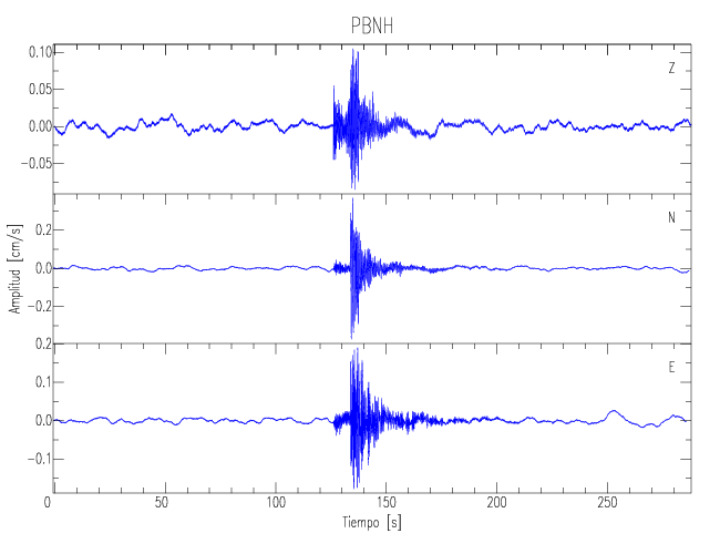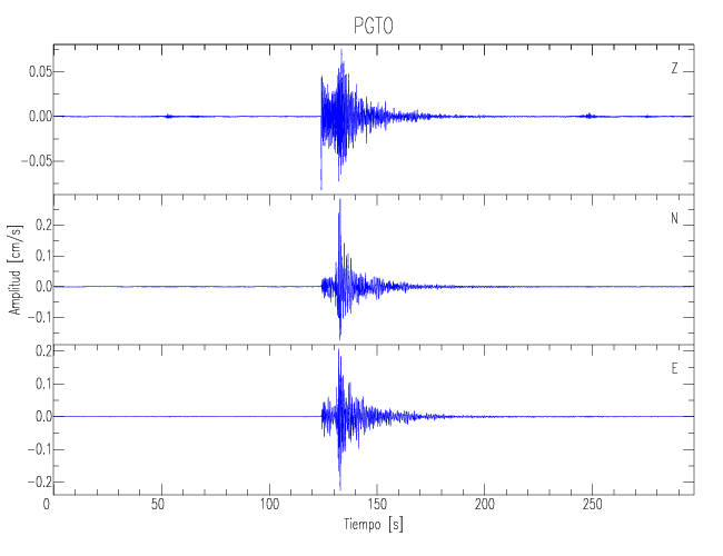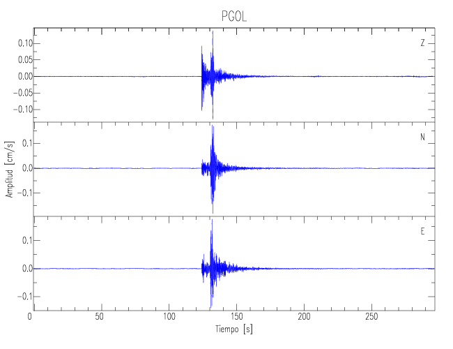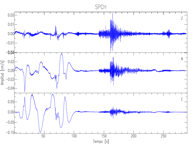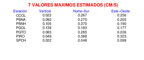 Los registros de velocidad se obtienen de la integración de los datos de aceleración. Esta tabla contiene los valores de velocidad máxima (PGV por sus siglas en inglés) para cada componente en cm/s. Las estaciones se listan en orden alfabético y corresponden a los sitios en que el nivel de aceleración fue superior a los 5 cm/s2.
