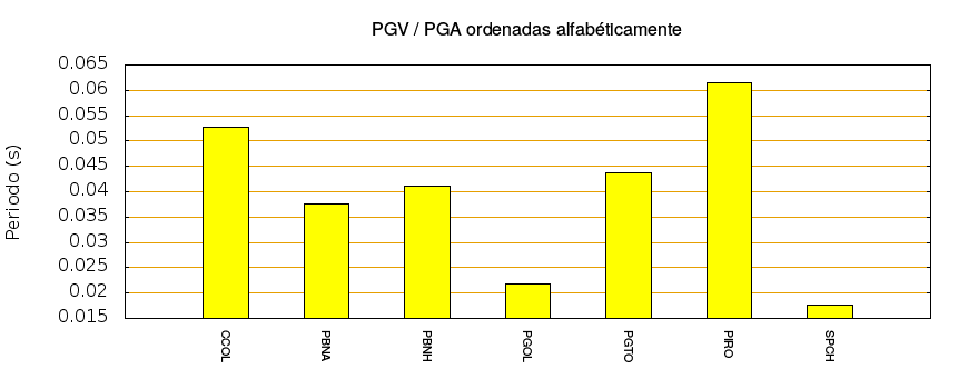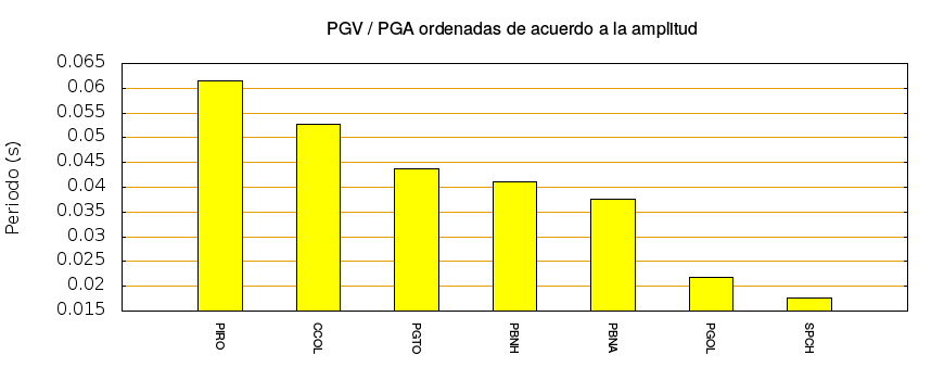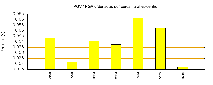 El cociente de la velocidad máxima (PGV) entre la aceleración máxima (PGA) brinda información de los periodos más significativos del movimiento del suelo. En el gráfico siguiente se muestran las estaciones ordenadas por su cercanía al epicentro. La más cercana está a la izquierda y la más lejana a la derecha. También se muestran los mismos datos en orden alfabético y ordenados de mayor a menor amplitud.