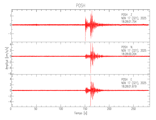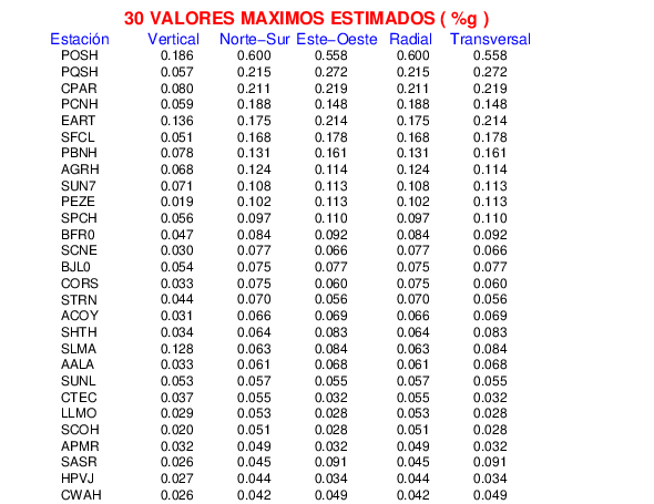 La siguiente tabla muestra los datos de aceleración máxima para cada componente en porcentaje de la aceleración de la gravedad (%g). Estos se obtienen dividiendo el valor del PGA registrado por 980 cm/s2 y multiplicándolo por 100. Los valores de las últimas dos columnas corresponden a la componente radial y transversal. Los datos se listan en orden descendente según el valor de la componente radial.