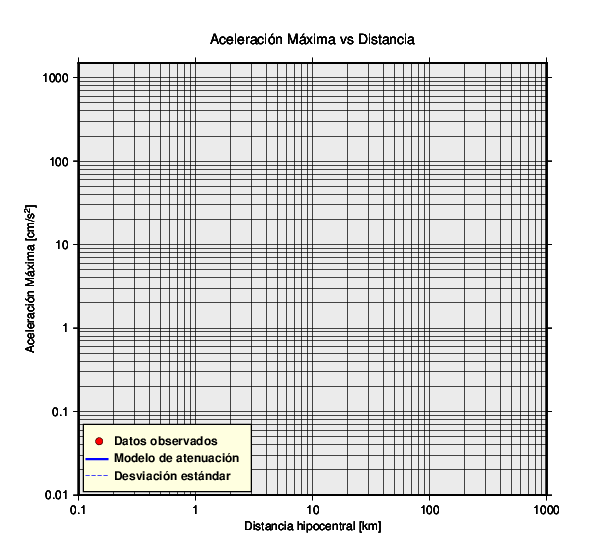 Datos del valor de la aceleración máxima (PGA por sus siglas en inglés) de cada estación (puntos rojos) en función de la distancia al hipocentro. Las trazas azules corresponden al modelo de atenuación y su respectiva desviación estándar.