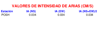 En esta sección se muestra el cáculo de la IA para la componente norte-sur (NS) y este-oeste (EW) de los registros de aceleración que tuvieron valores superiores a los 5 cm/s2, así como el valor total de esta que corresponde al promedio de ambas componentes horizontales.