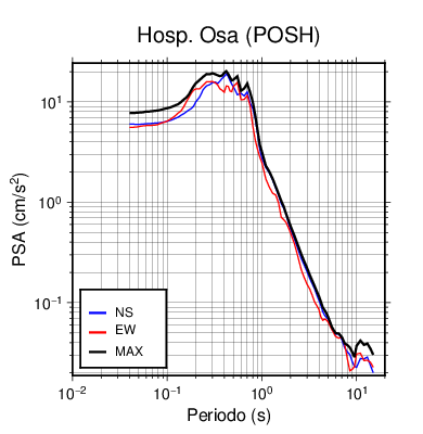 En los siguientes gráficos, la traza verde es el espectro propuesto por el CSCR-2010, la traza negra es el espectro máximo de este sismo. El valor de la amplitud está dado en pseudoaceleración en cm/s2.