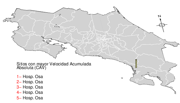 La velocidad acumulada absoluta (CAV por sus siglas en inglés) es otro parámetro que se usa para caracterizar el movimiento fuerte del suelo. Los datos están dados en cm/s para las componentes norte-sur (NS) y este-oeste (EW). El máximo de ambas se da en la tercera columna.