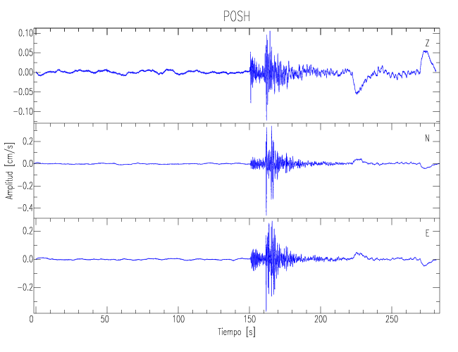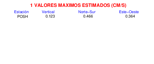 Los registros de velocidad se obtienen de la integración de los datos de aceleración. Esta tabla contiene los valores de velocidad máxima (PGV por sus siglas en inglés) para cada componente en cm/s. Las estaciones se listan en orden alfabético y corresponden a los sitios en que el nivel de aceleración fue superior a los 5 cm/s2.