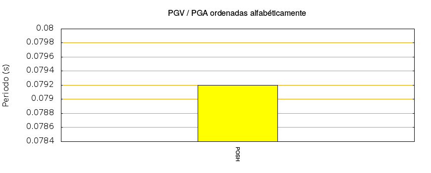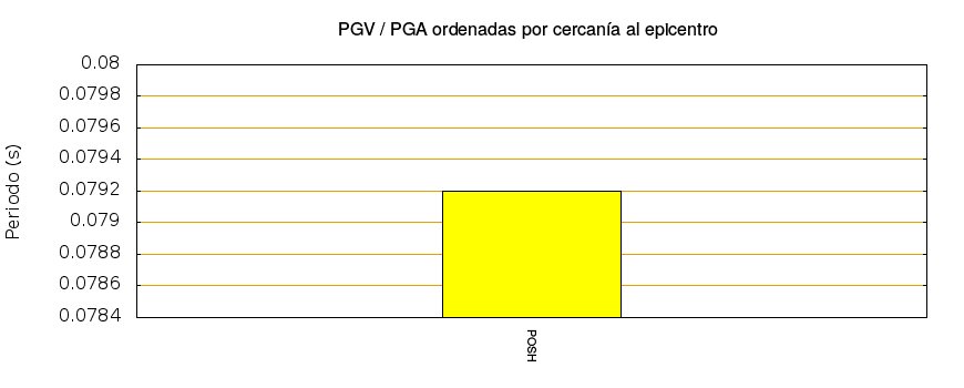 El cociente de la velocidad máxima (PGV) entre la aceleración máxima (PGA) brinda información de los periodos más significativos del movimiento del suelo. En el gráfico siguiente se muestran las estaciones ordenadas por su cercanía al epicentro. La más cercana está a la izquierda y la más lejana a la derecha. También se muestran los mismos datos en orden alfabético y ordenados de mayor a menor amplitud.