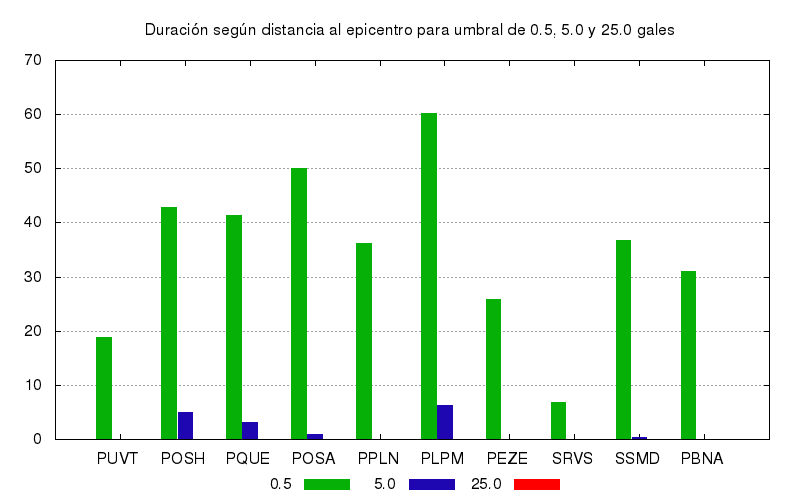 La duración para otros niveles de aceleración también se calculó. Este es el gráfico con los valores de duración para umbrales de 0.5, 5.0 y 25.0 gales. Se muestran los 10 primeros sitios ordenados por su cercanía el epicentro.