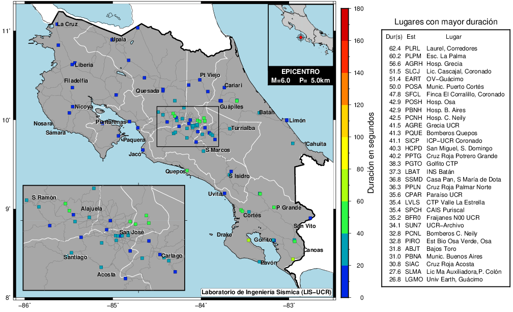 Este mapa muestra la duración en cada sitio de registro del LISUCR. Este parámetro se calculó sumando el tiempo que la amplitud del registro se mantuvo por encima de 0.5 cm/2. La tabla detalla el valor de los primeros 30 sitios con el código de la estación y el nombre del lugar donde se ubica.