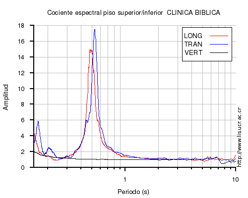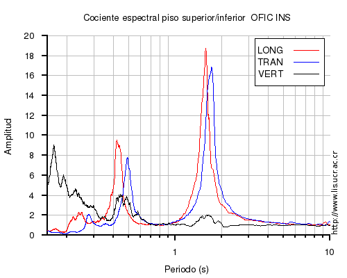 También se muestra el cociente espectral (en el rango de 0.1 a 10 s) entre el nivel superior (sea el último piso o la azotea) e inferior (sea el primero piso o el sótano) para cada una de las componentes LONG=longitudinal, TRAN=transversal y VERT=vertical. En los casos en que el nivel superior o inferior no estén disponibles al momento del sismo, se muestra una imagen con la leyenda "No se pudo calcular".