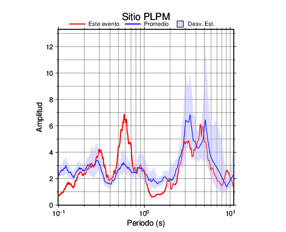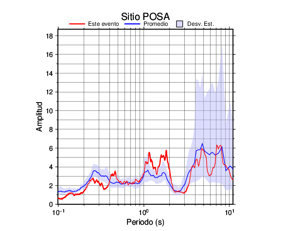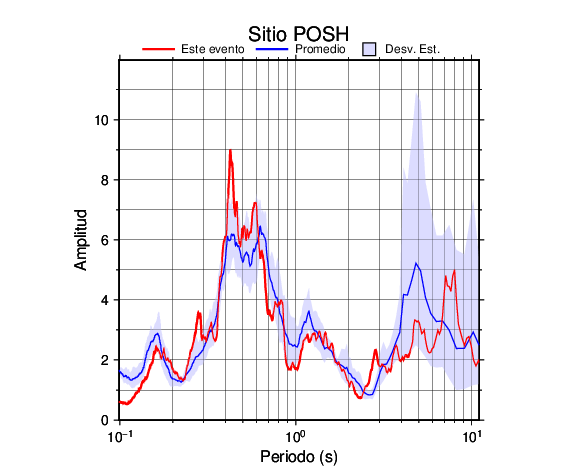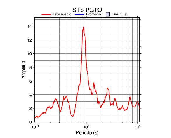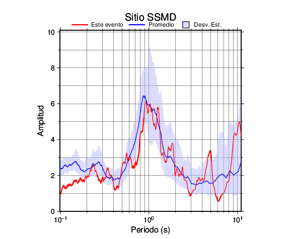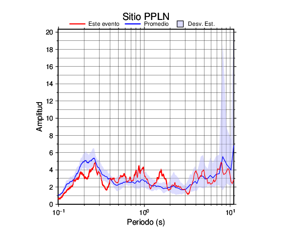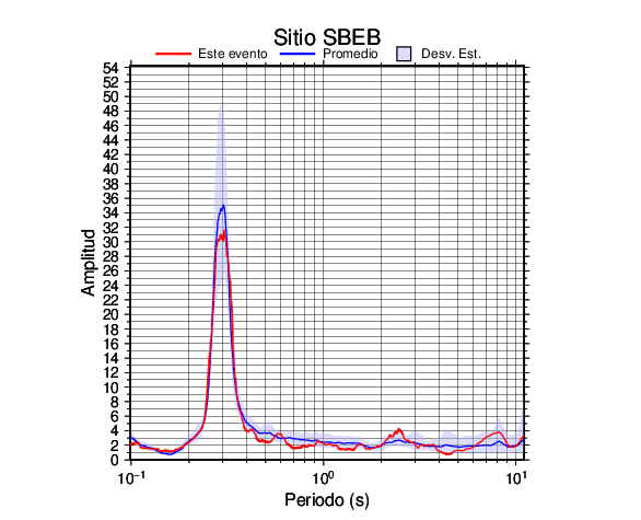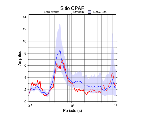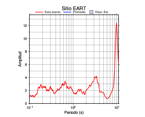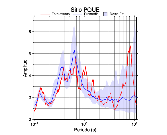 Los resultados que se presentan aquí fueron obtenidos luego de dividir las componentes horizontales entre la componente vertical (conocido como técnica H/V). Se grafica tanto el efecto de sitio del sismo registrado como el valor promedio en cada estación y su correspondiente desviación estándar.