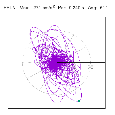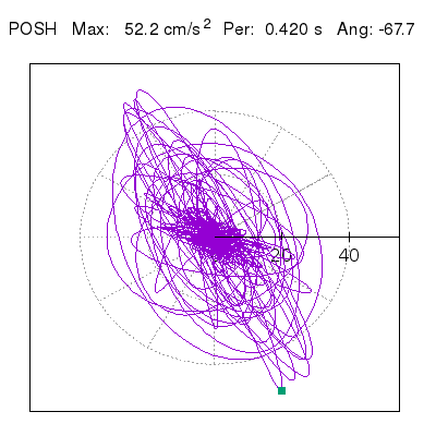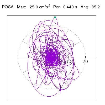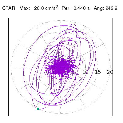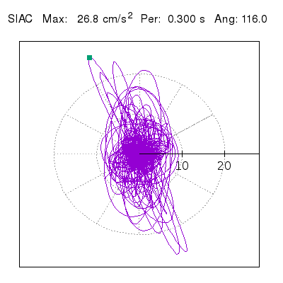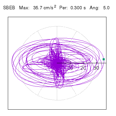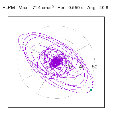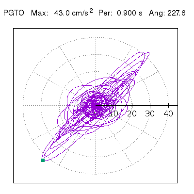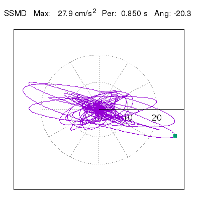 Tomando el periodo en el cual se presenta la amplitud máxima del espectro de respuesta máxima para cada estación, se representa la respuesta bidireccional en función del tiempo sobre el plano horizontal. Se identifica el punto (color verde en cada figura) del cual se desprende la orientación mostrada en el mapa de la sección superior. El valor de la acelereración máxima corresponde al punto del espectro de respuesta para el periodo indicado.