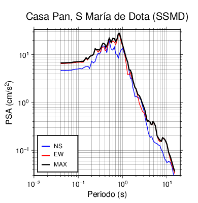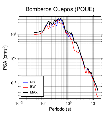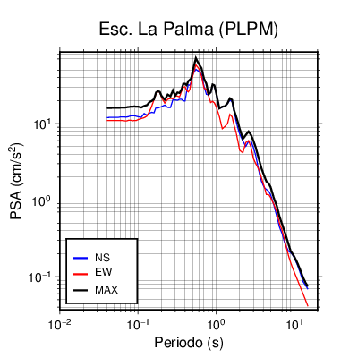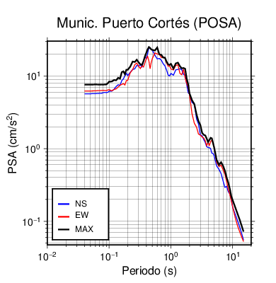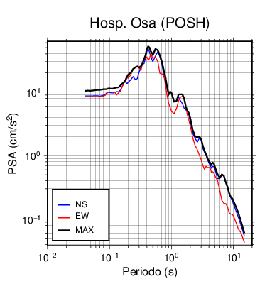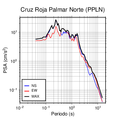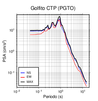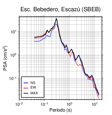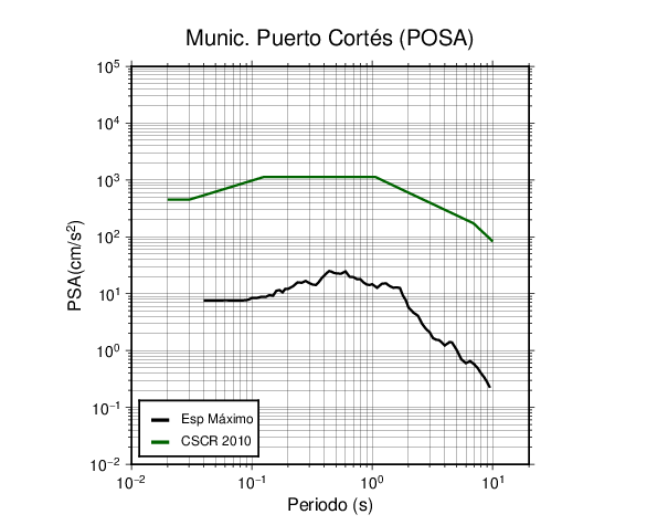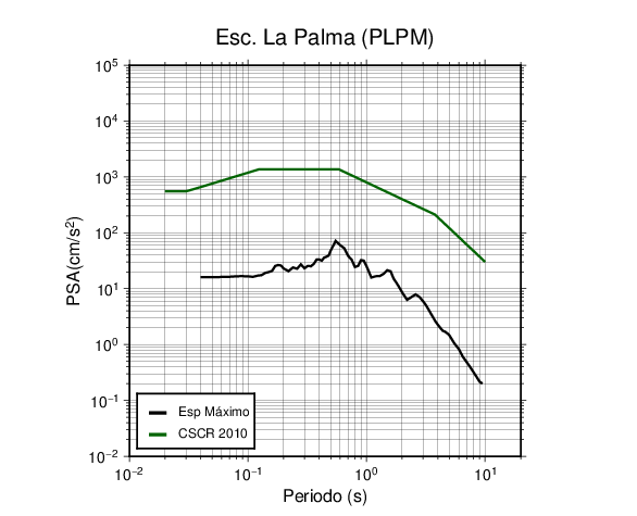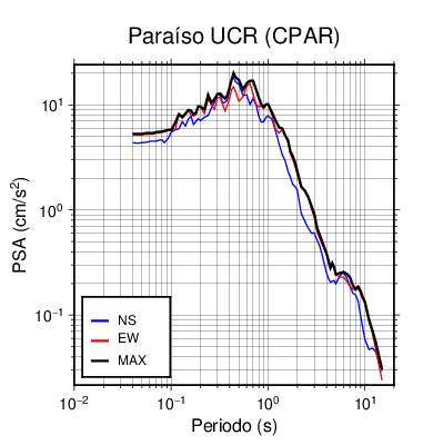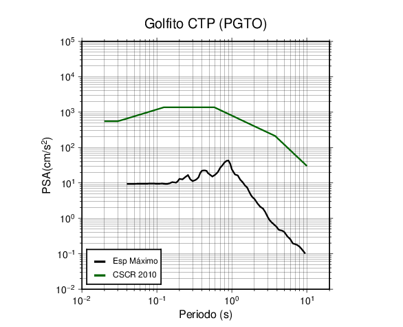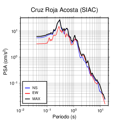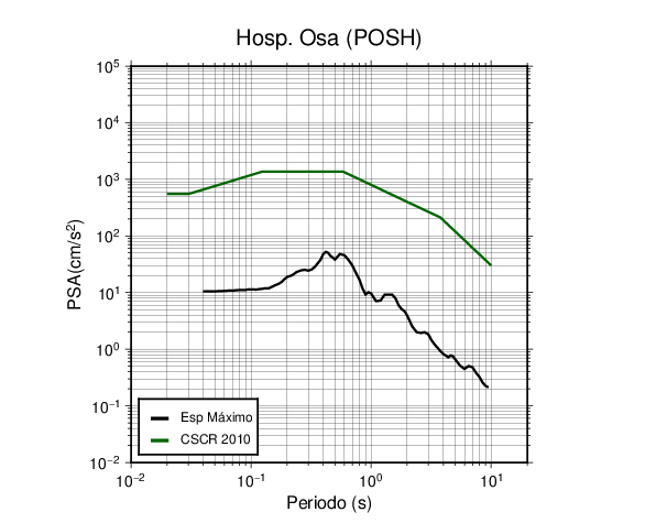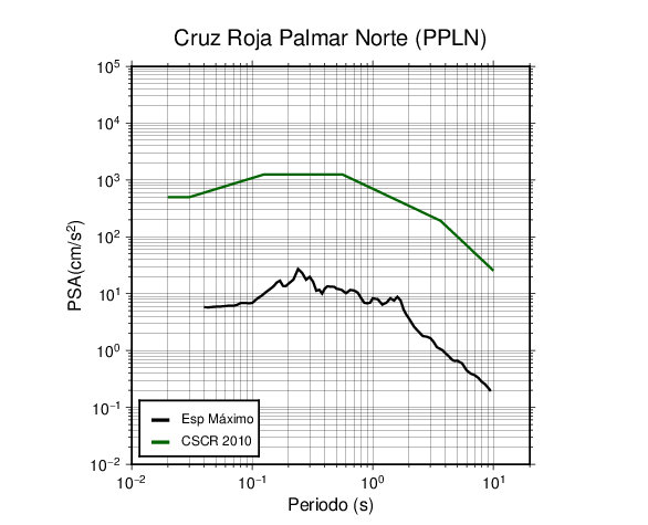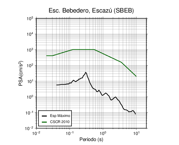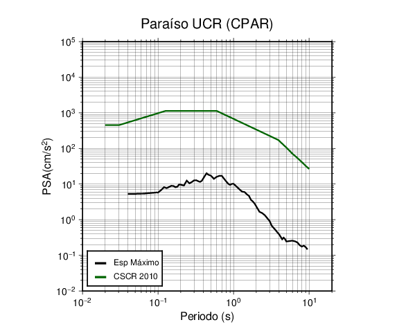 En los siguientes gráficos, la traza verde es el espectro propuesto por el CSCR-2010, la traza negra es el espectro máximo de este sismo. El valor de la amplitud está dado en pseudoaceleración en cm/s2.