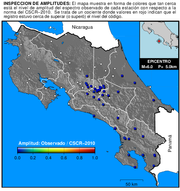 El siguiente mapa muestra de manera resumida qué tan cerca estuvo la amplitud del espectro de respuesta de cada estación de superar el nivel del espectro de diseño del CSCR-2010. El cálculo consiste en comparar periodo a periodo la amplitud del espectro observado con el nivel propuesto por el código en cada sitio para el tipo de suelo y zona sísmica correspondiente.