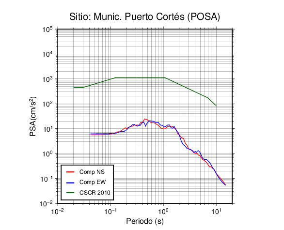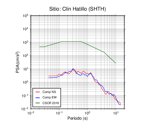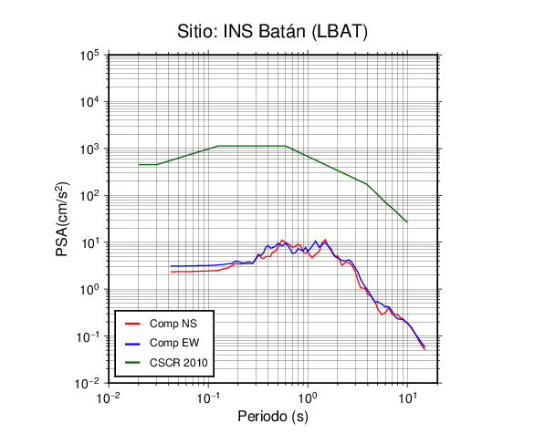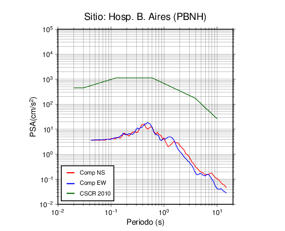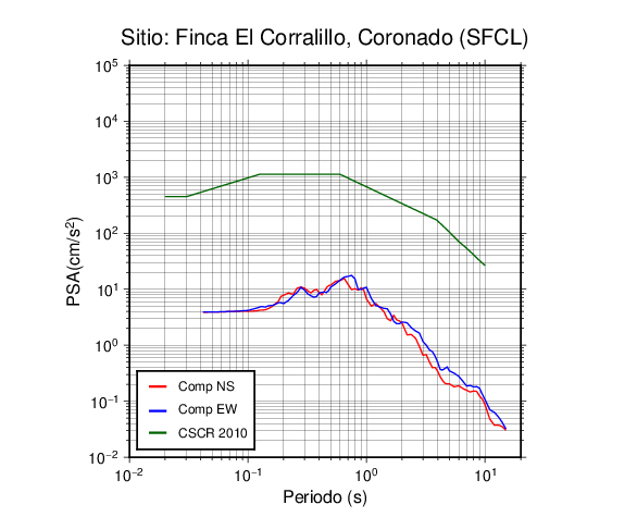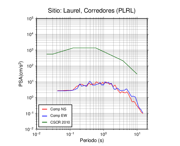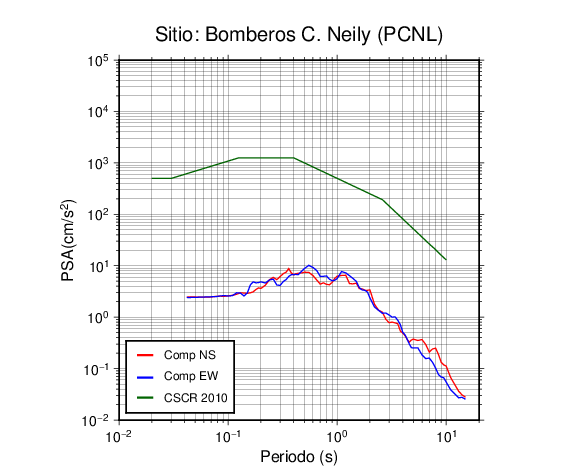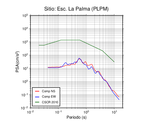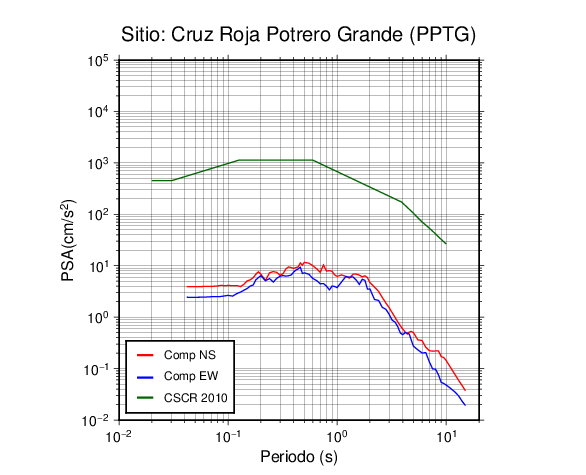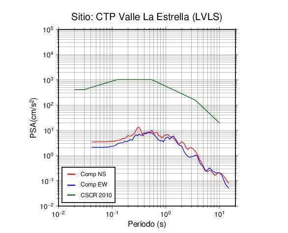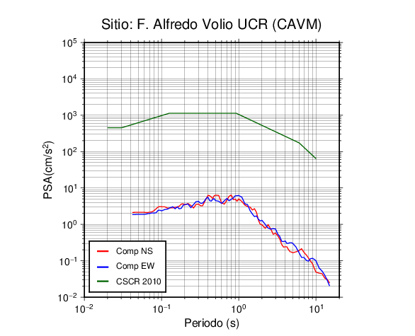 En los siguientes gráficos, la traza verde es el espectro propuesto por el CSCR-2010, la traza roja es el espectro de este sismo en la componente norte-sur (NS) y la traza azul la componente este-oeste (EW). El valor de la amplitud está dado en pseudoaceleración en cm/s2.