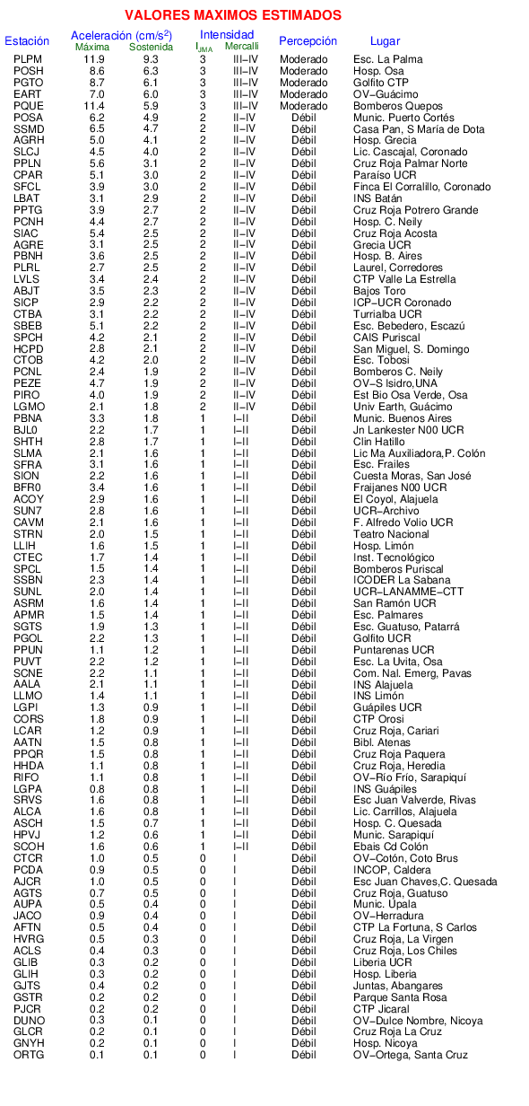 La siguiente tabla muestra los valores de Aceleración Máxima o aceleración pico (PGA por sus siglas en inglés). Este es el valor máximo en cualquiera de las 3 componentes del registro.