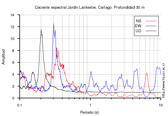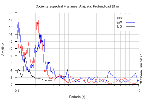 El cociente espectral se obtuvo dividiendo el espectro de amplitud de la componente en superficie con respecto a la componente en profundidad (NS=norte-sur, EW=este-oeste, UD=vertical)