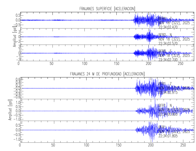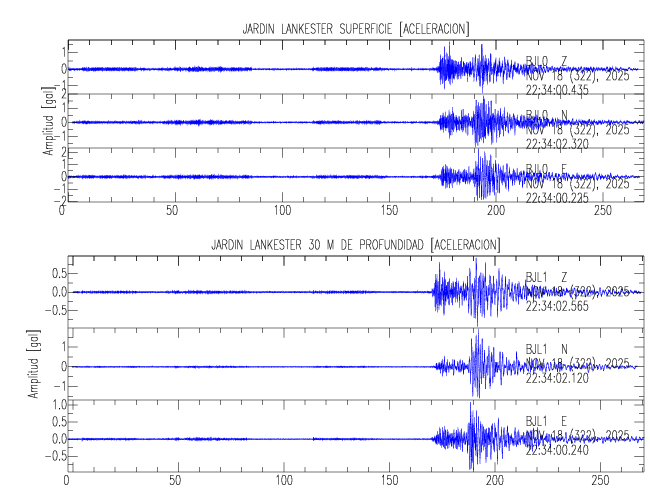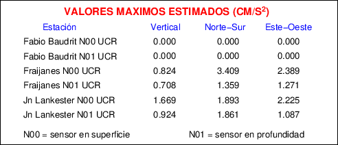 Aquí se muestran las formas de onda y cocientes espectrales de los sensores colocados en pozo . Uno se ubica en el Jardín Lankester en Paraíso de Cartago con 30 m de profundidad y el otro en la Estación Experimental Fabio Baudrit en Alajuela con 40 m de profundidad. La tabla muestra los valores de aceleración máxima (PGA) leídos de las tres componentes en superficie (N00) y en profundidad (N01)