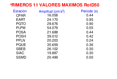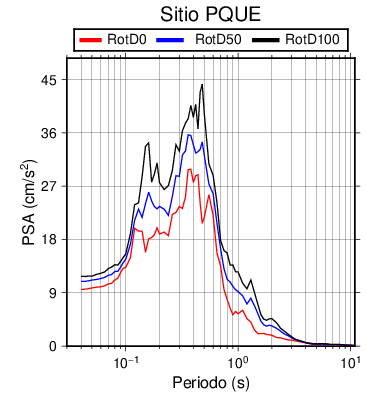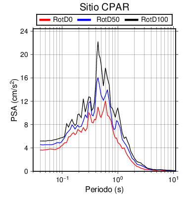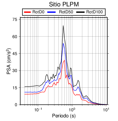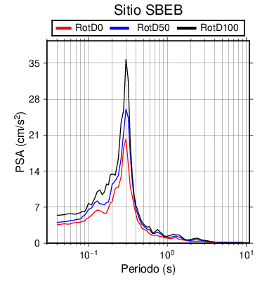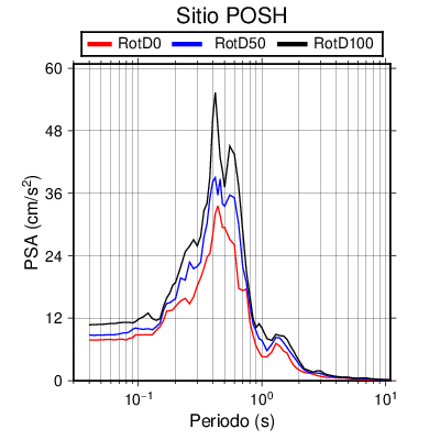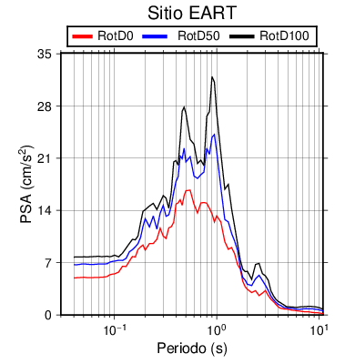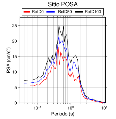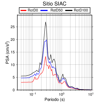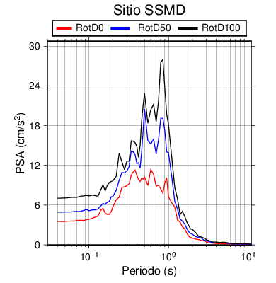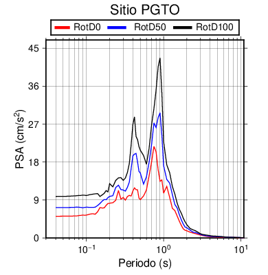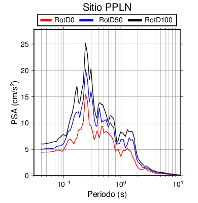RotD50 representa un valor medio de la respuesta por lo cual se puede comparar con valores de otras medidas empleadas en modelos de atenuación como la Media Geométrica de las componentes ortogonales (GM). RotD0 y RotD100 son los valores extremos (mínimo y máximo), los cuales nos pueden servir para determinar la dispersión de la posible respuesta en cada sitio.