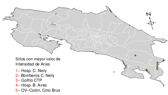 Mapa mostrando la IA en cada sitio de registro. Se grafica el valor máximo de la tabla anterior.