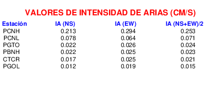 En esta sección se muestra el cáculo de la IA para la componente norte-sur (NS) y este-oeste (EW) de los registros de aceleración que tuvieron valores superiores a los 5 cm/s2, así como el valor total de esta que corresponde al promedio de ambas componentes horizontales.